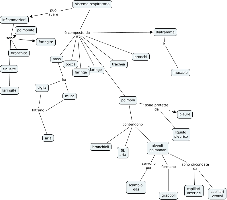 sistema respiratorio, naso ha muco, alveoli polmonari formano grappoli, infiammazioni sono bronchite, diaframma è muscolo, sistema respiratorio è composto da bronchi, infiammazioni sono laringite, alveoli polmonari servono per scambio gas, sistema respiratorio è composto da trachea, infiammazioni sono polmonite, muco filtrano aria