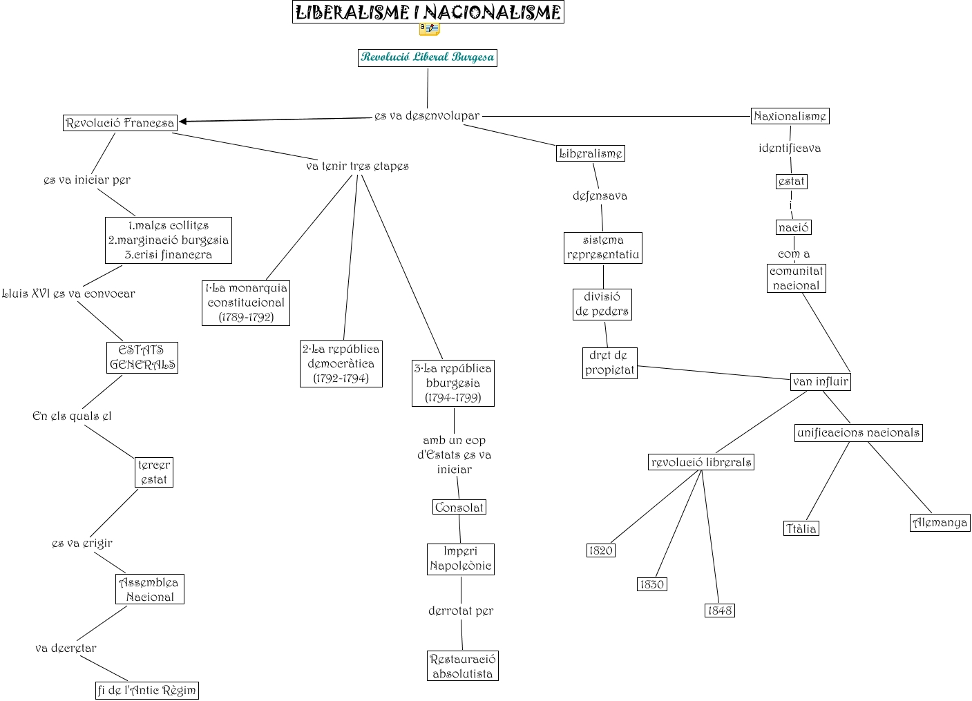 Aquest mapa conceptual conté informació relacionada amb: liberalisme_chenlin, 1.males collites 2.marginació burgesia 3.crisi financera Lluis XVI es va convocar ESTATS GENERALS, Revolució Liberal Burgesa es va desenvolupar Revolució Francesa, estat i nació, Revolució Francesa va tenir tres etapes 3·La república bburgesia (1794-1799), tercer estat es va erigir Assemblea Nacional, ESTATS GENERALS En els quals el tercer estat, unificacions nacionals ???? Alemanya, revolució librerals ???? 1848, comunitat nacional ???? van influir, Naxionalisme identificava estat, Revolució Francesa es va iniciar per 1.males collites 2.marginació burgesia 3.crisi financera, nació com a comunitat nacional, Naxionalisme es va desenvolupar Revolució Francesa, sistema representatiu ???? divisió de peders, 3·La república bburgesia (1794-1799) amb un cop d'Estats es va iniciar Consolat, Imperi Napoleònic derrotat per Restauració absolutista, Liberalisme es va desenvolupar Revolució Francesa, Revolució Francesa va tenir tres etapes 2·La república democràtica (1792-1794), revolució librerals ???? 1820, Consolat ???? Imperi Napoleònic