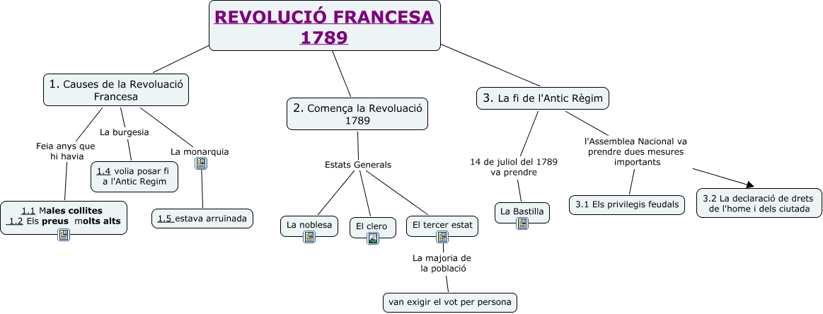 Aquest mapa conceptual conté informació relacionada amb: Revolucio_francesa, 3. La fi de l'Antic Règim 14 de juliol del 1789 va prendre La Bastilla, 2. Comença la Revoluació 1789 Estats Generals El clero, 1. Causes de la Revoluació Francesa La monarquia 1.5 estava arruïnada, REVOLUCIÓ FRANCESA 1789 ???? 1. Causes de la Revoluació Francesa, 3. La fi de l'Antic Règim l'Assemblea Nacional va prendre dues mesures importants 3.2 La declaració de drets de l'home i dels ciutada, 2. Comença la Revoluació 1789 Estats Generals La noblesa, REVOLUCIÓ FRANCESA 1789 ???? 3. La fi de l'Antic Règim, 3. La fi de l'Antic Règim l'Assemblea Nacional va prendre dues mesures importants 3.1 Els privilegis feudals, El tercer estat La majoria de la població van exigir el vot per persona, 2. Comença la Revoluació 1789 Estats Generals El tercer estat, 1. Causes de la Revoluació Francesa La burgesia 1.4 volia posar fi a l'Antic Regim, 1. Causes de la Revoluació Francesa Feia anys que hi havia 1.1 Males collites 1.2 Els preus molts alts, REVOLUCIÓ FRANCESA 1789 ???? 2. Comença la Revoluació 1789