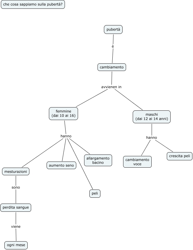 puberta, pubertà è cambiamento, femmine (dai 10 ai 16) hanno allargamento bacino, mesturazioni sono perdita sangue, femmine (dai 10 ai 16) hanno aumento seno, femmine (dai 10 ai 16) hanno peli, cambiamento avvienen in femmine (dai 10 ai 16), maschi (dai 12 ai 14 anni) hanno crescita peli, femmine (dai 10 ai 16) hanno mesturazioni, perdita sangue viene ogni mese, maschi (dai 12 ai 14 anni) hanno cambiamento voce