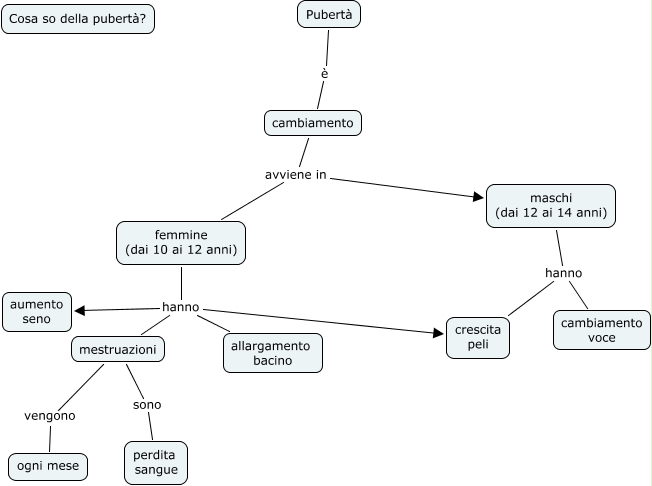 pubertà, mestruazioni vengono ogni mese, femmine (dai 10 ai 12 anni) hanno aumento seno, cambiamento avviene in maschi (dai 12 ai 14 anni), femmine (dai 10 ai 12 anni) hanno crescita peli, Pubertà è cambiamento, maschi (dai 12 ai 14 anni) hanno cambiamento voce, maschi (dai 12 ai 14 anni) hanno crescita peli, mestruazioni sono perdita sangue, cambiamento avviene in femmine (dai 10 ai 12 anni), femmine (dai 10 ai 12 anni) hanno allargamento bacino