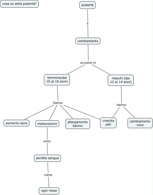 pubertà, femmine(dai 10 ai 16 anni) hanno aumento seno, femmine(dai 10 ai 16 anni) hanno mesturazioni, maschi (dai 12 ai 14 anni) hanno cambiamento voce, femmine(dai 10 ai 16 anni) hanno allargamento bacino, femmine(dai 10 ai 16 anni) hanno crescita peli, cambiamento avviene in femmine(dai 10 ai 16 anni), cambiamento avviene in maschi (dai 12 ai 14 anni), perdita sangue viene ogni mese, mesturazioni sono perdita sangue, pubertà è cambiamento