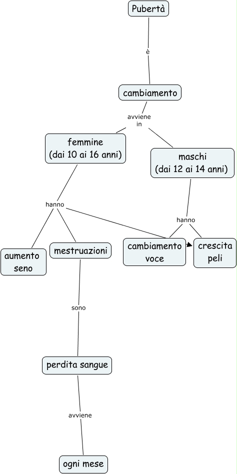 pubertà, femmine (dai 10 ai 16 anni) hanno crescita peli, cambiamento avviene in femmine (dai 10 ai 16 anni), Pubertà è cambiamento, mestruazioni sono perdita sangue, maschi (dai 12 ai 14 anni) hanno cambiamento voce, femmine (dai 10 ai 16 anni) hanno mestruazioni, femmine (dai 10 ai 16 anni) hanno aumento seno, cambiamento avviene in maschi (dai 12 ai 14 anni), maschi (dai 12 ai 14 anni) hanno crescita peli, perdita sangue avviene ogni mese