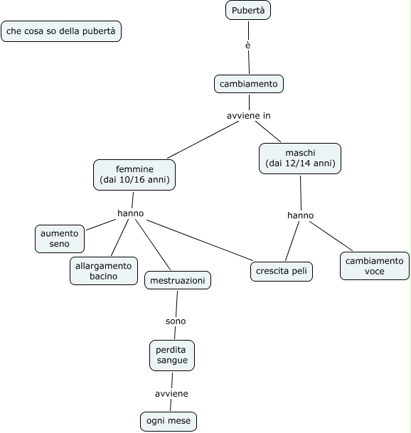 pubertà, maschi (dai 12/14 anni) hanno crescita peli, femmine (dai 10/16 anni) hanno mestruazioni, perdita sangue avviene ogni mese, cambiamento avviene in femmine (dai 10/16 anni), cambiamento avviene in maschi (dai 12/14 anni), femmine (dai 10/16 anni) hanno aumento seno, mestruazioni sono perdita sangue, femmine (dai 10/16 anni) hanno allargamento bacino, femmine (dai 10/16 anni) hanno crescita peli, maschi (dai 12/14 anni) hanno cambiamento voce