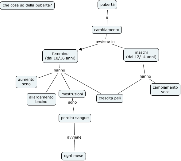 pubertà, maschi (dai 12/14 anni) hanno cambiamento voce, pubertà è cambiamento, femmine (dai 10/16 anni) hanno aumento seno, cambiamento avviene in femmine (dai 10/16 anni), femmine (dai 10/16 anni) hanno crescita peli, femmine (dai 10/16 anni) hanno allargamento bacino, perdita sangue avviene ogni mese, mestruzioni sono perdita sangue, maschi (dai 12/14 anni) hanno crescita peli, cambiamento avviene in maschi (dai 12/14 anni)