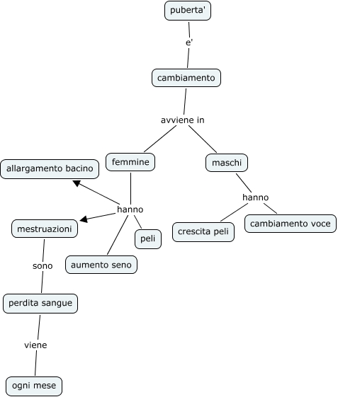 puberta', femmine hanno aumento seno, femmine hanno peli, maschi hanno crescita peli, maschi hanno cambiamento voce, cambiamento avviene in femmine, puberta' e' cambiamento, femmine hanno allargamento bacino, perdita sangue viene ogni mese, cambiamento avviene in maschi, mestruazioni sono perdita sangue