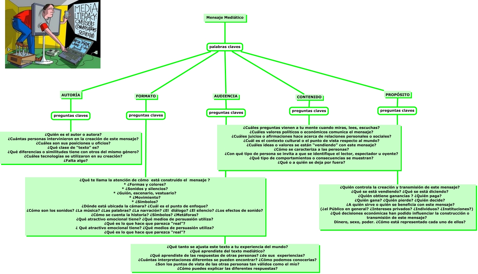 Este mapa conceptual tiene información relacionada a: El mensaje mediático, Mensaje Mediático palabras claves CONTENIDO, Mensaje Mediático palabras claves FORMATO, PROPÓSITO preguntas claves ¿Quién controla la creación y transmisión de este mensaje? ¿Qué se está vendiendo? ¿Qué se está diciendo? ¿Quién obtiene ganancias ? ¿Quién paga? ¿Quién gana? ¿Quién pierde? ¿Quién decide? ¿A quién sirve o quién se beneficia con este mensaje? (¿el Público en general? ¿Intereses privados? ¿Individuos? ¿Instituciones?) ¿Qué decisiones económicas han podido influenciar la construcción o transmisión de este mensaje? Dinero, sexo, poder. ¿Cómo está representado cada uno de ellos?, Mensaje Mediático palabras claves AUTORÍA, FORMATO preguntas claves ¿Qué te llama la atención de cómo está construido el mensaje ? * ¿Formas y colores? * ¿Sonidos y silencios? * ¿Guión, escenario, vestuario? * ¿Movimiento? * ¿Símbolos? ¿Dónde está ubicada la cámara? ¿Cuál es el punto de enfoque? ¿Cómo son los sonidos? ¿La música? ¿Las palabras? ¿La narración? ¿El diálogo? ¿El silencio? ¿Los efectos de sonido? ¿Cómo se cuenta la historia? ¿Símbolos? ¿Metáforas? ¿Qué atractivo emocional tiene? ¿Qué medios de persuasión utiliza? ¿Qué es lo que hace que parezca “real”? ¿ Qué atractivo emocional tiene? ¿Qué medios de persuasión utiliza? ¿Qué es lo que hace que parezca “real”?, AUTORÍA preguntas claves ¿Quién es el autor o autora? ¿Cuántas personas intervinieron en la creación de este mensaje? ¿Cuáles son sus posiciones u oficios? ¿Qué clase de “texto” es? ¿Qué diferencias o similitudes tiene con otros del mismo género? ¿Cuáles tecnologías se utilizaron en su creación? ¿Falta algo?, CONTENIDO preguntas claves ¿Cuáles preguntas vienen a tu mente cuando miras, lees, escuchas? ¿Cuáles valores políticos o económicos comunica el mensaje? ¿Cuáles juicios o afirmaciones hace acerca de relaciones personales o sociales? ¿Cuál es el contexto cultural o el punto de vista respecto al mundo? ¿Cuáles ideas o valores se están “vendiendo” con este mensaje? ¿Cómo se caracteriza a las personas? ¿Con qué tipo de persona se invita a que se identifique el lector, espectador u oyente? ¿Qué tipo de comportamientos o consecuencias se muestran? ¿Qué o a quién se deja por fuera?, Mensaje Mediático palabras claves PROPÓSITO, AUDIENCIA preguntas claves ¿Qué tanto se ajusta este texto a tu experiencia del mundo? ¿Qué aprendiste del texto mediático? ¿Qué aprendiste de las respuestas de otras personas? ¿de sus experiencias? ¿Cuántas interpretaciones diferentes se pueden encontrar? ¿Cómo podemos conocerlas? ¿Son los puntos de vista de las otras personas tan válidos como el mío? ¿Cómo puedes explicar las diferentes respuestas?, Mensaje Mediático palabras claves AUDIENCIA