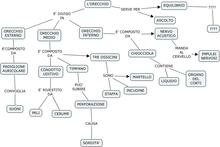 MAPPA CONCETTUALE APPARATO UDITIVO, L'ORECCHIO E' DIVISO IN ORECCHIO INTERNO, L'ORECCHIO E' DIVISO IN ORECCHIO ESTERNO, ORECCHIO INTERNO E' COMPOSTO DA CHIOCCIOLA, L'ORECCHIO SERVE PER EQUILIBRIO, ORECCHIO MEDIO E' COMPOSTO DA TRE OSSICINI, L'ORECCHIO E' DIVISO IN ORECCHIO MEDIO, CONDOTTO UDITIVO E' RIVESTITO DA PELI, TIMPANO PUO' SUBIRE PERFORAZIONE, NERVO ACUSTICO MANDA AL CERVELLO IMPULSI NERVOSI, TRE OSSICINI SONO INCUDINE