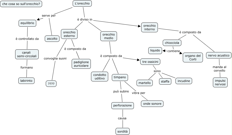 l orecchio, L'orecchio serve per ascolto, orecchio esterno convoglia suoni ????, L'orecchio è diviso in orecchio medio, orecchio interno è composto da nervo acustico, timpano può subire perforazione, L'orecchio è diviso in orecchio esterno, orecchio interno è composto da chiocciola, chiocciola contiene organo del Corti, orecchio medio è composto da tre ossicini, equilibrio è controllato da canali semi-circolali