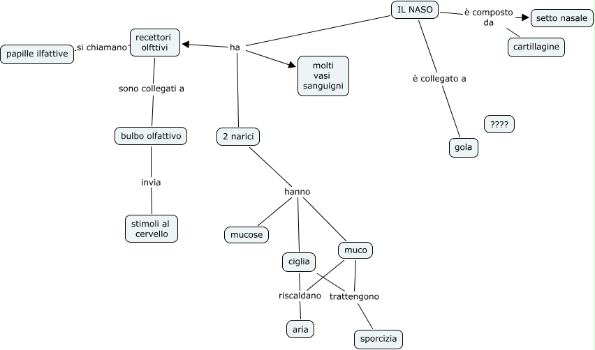 naso, recettori olfttivi si chiamano papille ilfattive, IL NASO ha recettori olfttivi, 2 narici hanno ciglia, IL NASO ha molti vasi sanguigni, muco riscaldano aria, 2 narici hanno muco, IL NASO ha 2 narici, bulbo olfattivo invia stimoli al cervello, IL NASO è composto da cartillagine, recettori olfttivi sono collegati a bulbo olfattivo
