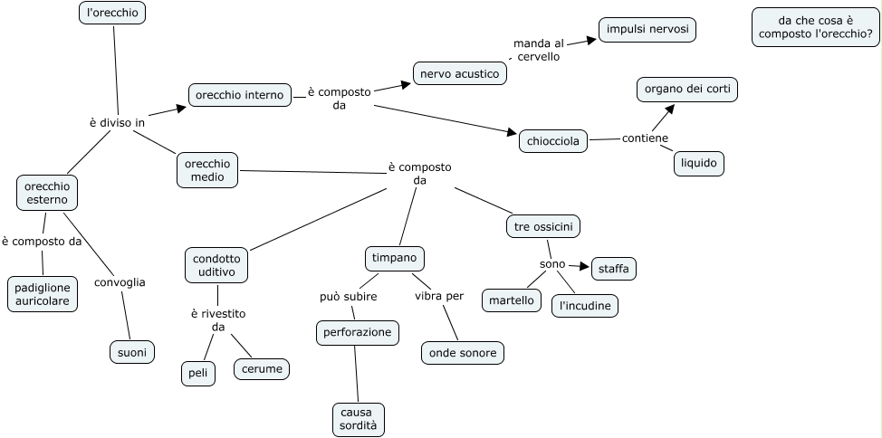 l'orecchio, l'orecchio è diviso in orecchio interno, orecchio medio è composto da timpano, orecchio interno è composto da nervo acustico, chiocciola contiene organo dei corti, orecchio esterno è composto da padiglione auricolare, tre ossicini sono l'incudine, tre ossicini sono staffa, condotto uditivo è rivestito da cerume, l'orecchio è diviso in orecchio esterno, chiocciola contiene liquido