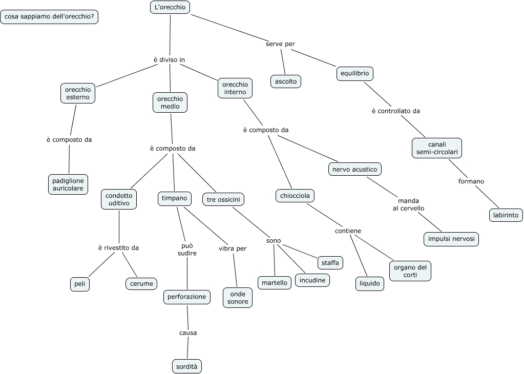 apparato uditivo, L'orecchio è diviso in orecchio medio, orecchio interno è composto da nervo acustico, nervo acustico manda al cervello impulsi nervosi, L'orecchio serve per equilibrio, orecchio interno è composto da chiocciola, orecchio medio è composto da condotto uditivo, tre ossicini sono staffa, L'orecchio serve per ascolto, perforazione causa sordità, timpano vibra per onde sonore