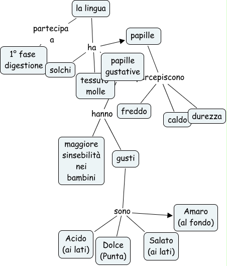 la lingua, papille gustative hanno gusti, gusti sono Acido (ai lati), gusti sono Amaro (al fondo), papille percepiscono caldo, papille percepiscono durezza, la lingua ha papille, gusti sono Salato (ai lati), papille percepiscono freddo, gusti sono Dolce (Punta), la lingua ha solchi