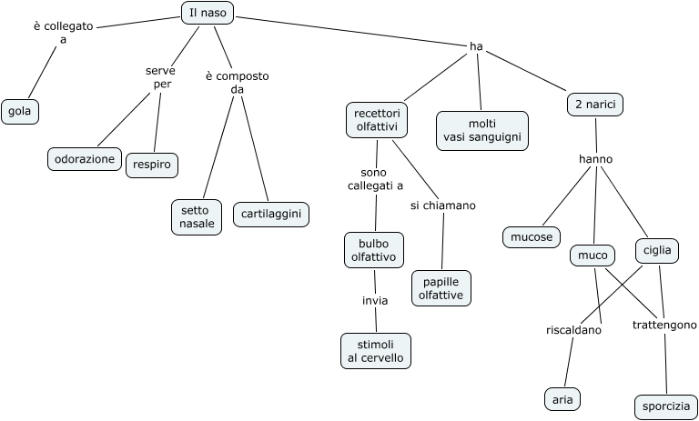 iln naso, Il naso ha molti vasi sanguigni, Il naso è composto da setto nasale, Il naso serve per respiro, bulbo olfattivo invia stimoli al cervello, Il naso è composto da cartilaggini, ciglia riscaldano aria, 2 narici hanno ciglia, Il naso ha recettori olfattivi, Il naso è collegato a gola, muco trattengono sporcizia
