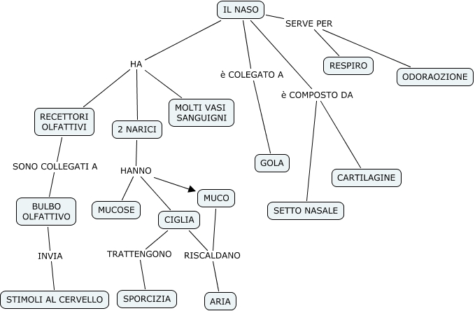 IL NASO, 2 NARICI HANNO MUCOSE, IL NASO è COMPOSTO DA CARTILAGINE, IL NASO è COMPOSTO DA SETTO NASALE, IL NASO HA RECETTORI OLFATTIVI, CIGLIA RISCALDANO ARIA, 2 NARICI HANNO MUCO, MUCO RISCALDANO ARIA, CIGLIA TRATTENGONO SPORCIZIA, IL NASO HA MOLTI VASI SANGUIGNI, RECETTORI OLFATTIVI SONO COLLEGATI A BULBO OLFATTIVO