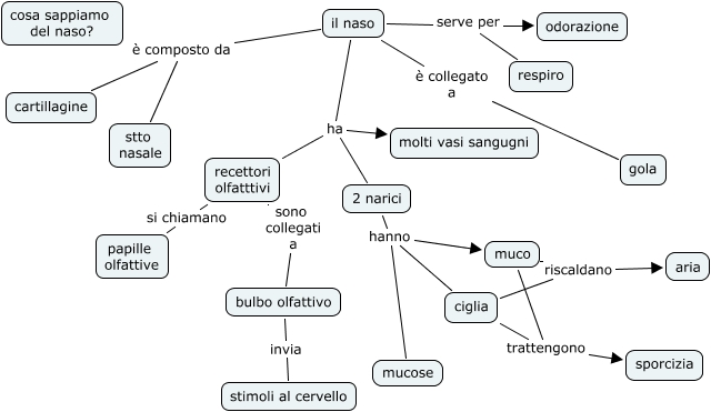 mappa concettuale sul naso giacomoc, muco riscaldano aria, il naso ha 2 narici, il naso ha recettori olfatttivi, ciglia trattengono sporcizia, 2 narici hanno mucose, ciglia riscaldano aria, recettori olfatttivi si chiamano papille olfattive, il naso serve per respiro, muco trattengono sporcizia, bulbo olfattivo invia stimoli al cervello