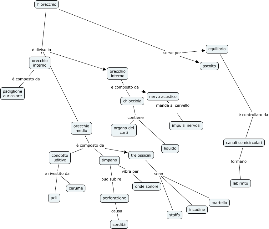 mappa concettuale giacomo c orecchio, orecchio medio è composto da condotto uditivo, l' orecchio è diviso in orecchio medio, orecchio interno è composto da nervo acustico, equilibrio è controllato da canali semicircolari, tre ossicini sono martello, l' orecchio è diviso in orecchio interno, nervo acustico manda al cervello impulsi nervosi, orecchio interno è composto da padiglione auricolare, timpano vibra per onde sonore, orecchio medio è composto da tre ossicini