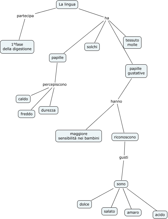la lingua, papille percepiscono caldo, riconoscono gusti sono, La lingua ha solchi, papille percepiscono freddo, sono ???? amaro, sono ???? dolce, La lingua ha tessuto molle, papille gustative hanno maggiore sensibilità nei bambini, sono ???? salato, papille gustative hanno riconoscono