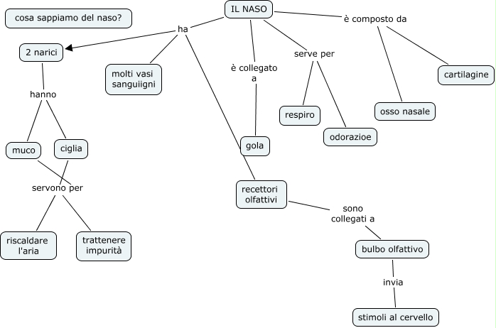 L'apparato olfattivo, IL NASO ha recettori olfattivi, IL NASO è composto da osso nasale, muco servono per riscaldare l'aria, IL NASO serve per odorazioe, IL NASO è collegato a gola, ciglia servono per riscaldare l'aria, IL NASO è composto da cartilagine, IL NASO ha 2 narici, 2 narici hanno muco, IL NASO ha molti vasi sanguiigni