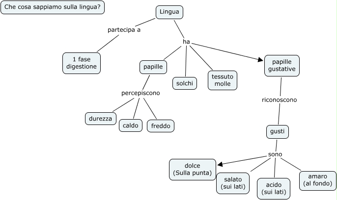 lingua, papille percepiscono caldo, Lingua ha solchi, Lingua ha papille, gusti sono acido (sui lati), Lingua partecipa a 1 fase digestione, papille percepiscono durezza, gusti sono salato (sui lati), Lingua ha papille gustative, Lingua ha tessuto molle, gusti sono amaro (al fondo)
