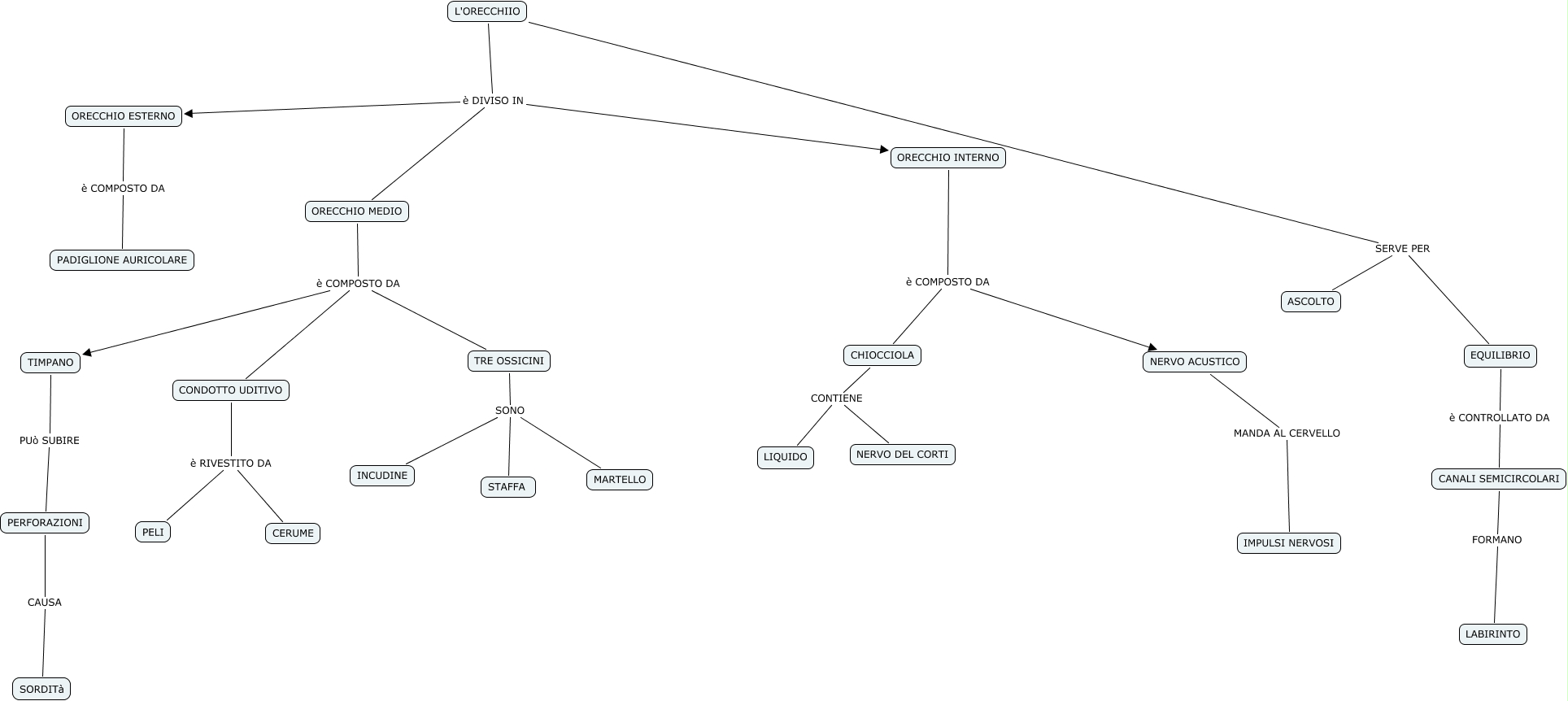 APPARATO UDITIVO, EQUILIBRIO è CONTROLLATO DA CANALI SEMICIRCOLARI, ORECCHIO ESTERNO è COMPOSTO DA PADIGLIONE AURICOLARE, L'ORECCHIIO è DIVISO IN ORECCHIO INTERNO, ORECCHIO MEDIO è COMPOSTO DA TRE OSSICINI, CANALI SEMICIRCOLARI FORMANO LABIRINTO, TRE OSSICINI SONO STAFFA, PERFORAZIONI CAUSA SORDITà, L'ORECCHIIO SERVE PER EQUILIBRIO, L'ORECCHIIO è DIVISO IN ORECCHIO ESTERNO, CHIOCCIOLA CONTIENE NERVO DEL CORTI