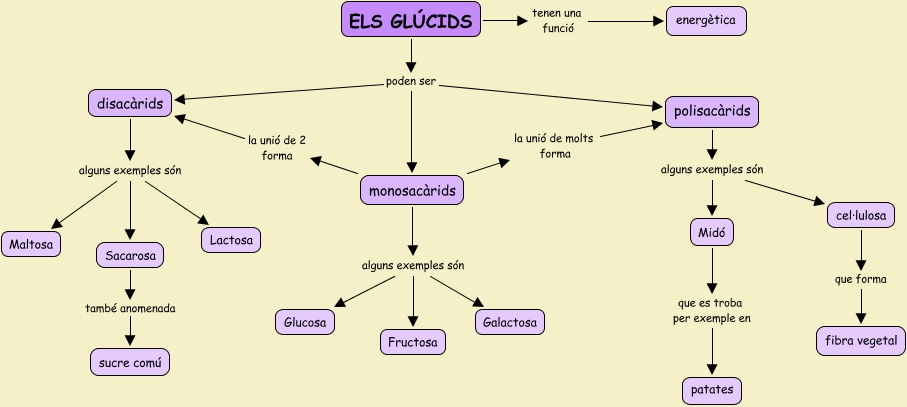 Este Cmap, tiene información relacionada con: Mapa conceptual sobre els glúcids, cel·lulosa que forma fibra vegetal, ELS GLÚCIDS poden ser polisacàrids, monosacàrids alguns exemples són Galactosa, disacàrids alguns exemples són Sacarosa, Sacarosa també anomenada sucre comú, ELS GLÚCIDS tenen una funció energètica, monosacàrids la unió de 2 forma disacàrids, monosacàrids la unió de molts forma polisacàrids, disacàrids alguns exemples són Maltosa, disacàrids alguns exemples són Lactosa, polisacàrids alguns exemples són Midó, monosacàrids alguns exemples són Fructosa, monosacàrids alguns exemples són Glucosa, ELS GLÚCIDS poden ser monosacàrids, Midó que es troba per exemple en patates, polisacàrids alguns exemples són cel·lulosa, ELS GLÚCIDS poden ser disacàrids