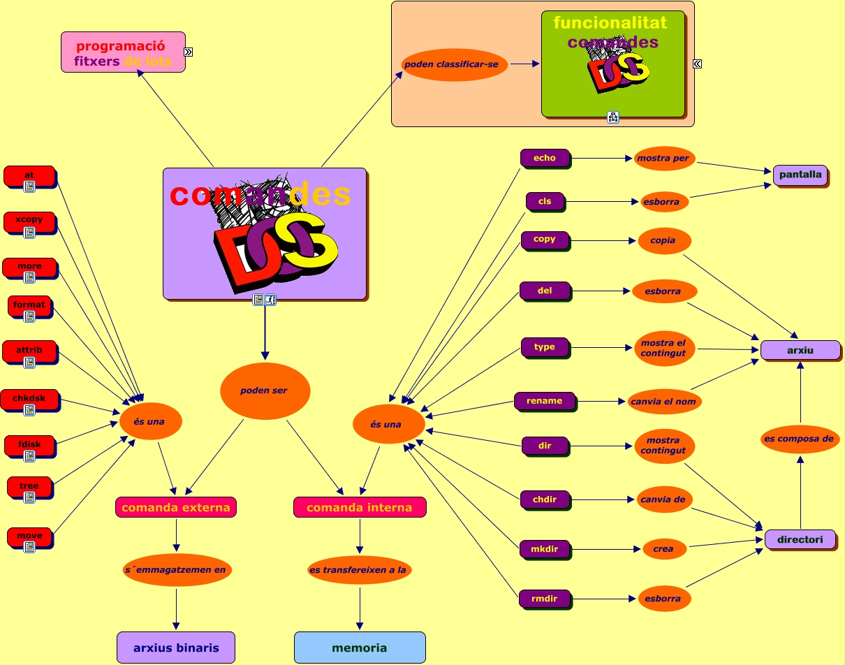 Este Cmap, tiene información relacionada con: CM1.Comandes MsDOS, chkdsk és una comanda externa, copy és una comanda interna, del és una comanda interna, move és una comanda externa, chdir és una comanda interna, rmdir esborra directori, type mostra el contingut arxiu, echo mostra per pantalla, type és una comanda interna, tree és una comanda externa, mkdir és una comanda interna, dir és una comanda interna, comanda externa s´emmagatzemen en arxius binaris, chdir canvia de directori, del esborra arxiu, rmdir és una comanda interna, mkdir crea directori, copy copia arxiu, at és una comanda externa, comanda interna es transfereixen a la memoria