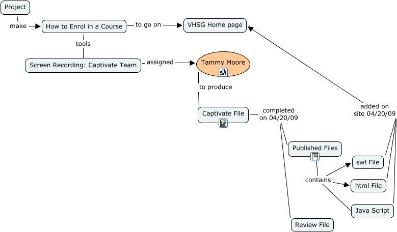 This Concept Map, created with IHMC CmapTools, has information related to: How to Enrol in a Coourse, Captivate File completed on 04/20/09 Review File, Captivate File completed on 04/20/09 Published Files, Project make How to Enrol in a Course, How to Enrol in a Course tools Screen Recording: Captivate Team, swf File added on site 04/20/09 VHSG Home page, Java Script added on site 04/20/09 VHSG Home page, How to Enrol in a Course to go on VHSG Home page, Published Files contains swf File, Published Files contains html File, Screen Recording: Captivate Team assigned Tammy Moore, Published Files contains Java Script, Tammy Moore to produce Captivate File, html File added on site 04/20/09 VHSG Home page