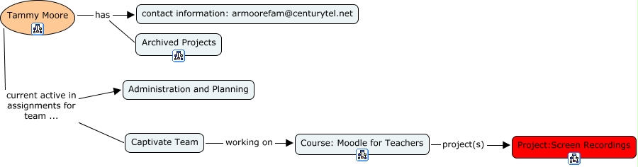 This Concept Map, created with IHMC CmapTools, has information related to: Tammy Moore, Tammy Moore has Archived Projects, Tammy Moore current active in assignments for team ... Captivate Team, Captivate Team working on Course: Moodle for Teachers, Tammy Moore has contact information: armoorefam@centurytel.net, Tammy Moore current active in assignments for team ... Administration and Planning, Course: Moodle for Teachers project(s) Project:Screen Recordings