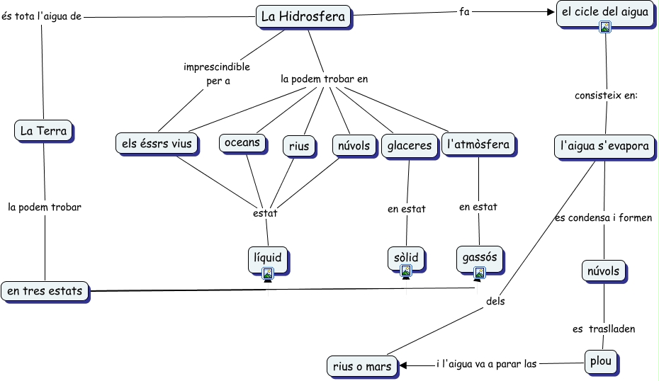 Este Cmap, tiene información relacionada con: la Hidrosfera, La Hidrosfera la podem trobar en l'atmòsfera, en tres estats gassós, La Hidrosfera la podem trobar en els éssrs vius, en tres estats líquid, La Hidrosfera la podem trobar en núvols, rius estat líquid, La Hidrosfera la podem trobar en oceans, La Hidrosfera la podem trobar en glaceres, glaceres en estat sòlid, La Terra la podem trobar en tres estats, La Hidrosfera és tota l'aigua de La Terra, en tres estats líquid, l'aigua s'evapora es condensa i formen núvols, l'aigua s'evapora dels rius o mars, en tres estats sòlid, l'atmòsfera en estat gassós, plou i l'aigua va a parar las rius o mars, núvols estat líquid, en tres estats líquid, La Hidrosfera fa el cicle del aigua