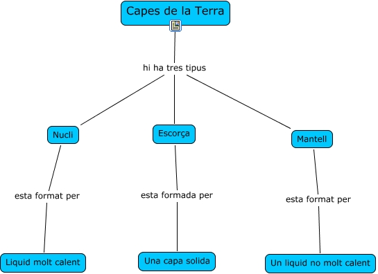 Este mapa conceptual tiene información relacionada a: Capes de la Terra, Escorça esta formada per Una capa solida, Nucli esta format per Liquid molt calent, Capes de la Terra hi ha tres tipus Escorça, Capes de la Terra hi ha tres tipus Nucli, Mantell esta format per Un liquid no molt calent, Capes de la Terra hi ha tres tipus Mantell