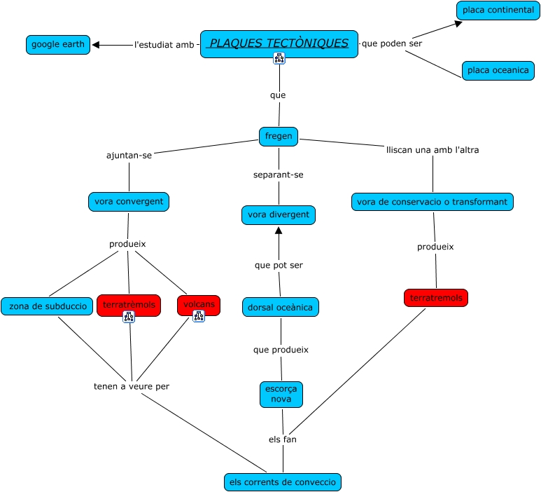 Este Cmap, tiene información relacionada con: Plaques Tectòniques, PLAQUES TECTÒNIQUES que fregen, dorsal oceànica que produeix escorça nova, vora convergent produeix volcans, volcans tenen a veure per els corrents de conveccio, zona de subduccio tenen a veure per els corrents de conveccio, escorça nova els fan els corrents de conveccio, PLAQUES TECTÒNIQUES l'estudiat amb google earth, dorsal oceànica que pot ser vora divergent, vora de conservacio o transformant produeix terratremols, PLAQUES TECTÒNIQUES que poden ser placa continental, terratrèmols tenen a veure per els corrents de conveccio, fregen separant-se vora divergent, vora convergent produeix terratrèmols, terratremols els fan els corrents de conveccio, fregen ajuntan-se vora convergent, vora convergent produeix zona de subduccio, PLAQUES TECTÒNIQUES que poden ser placa oceanica, fregen lliscan una amb l'altra vora de conservacio o transformant