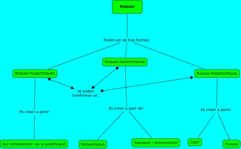 Este Cmap, tiene información relacionada con: Les roques, Roques Sedimentaries Es crean a patir de: transport i sedimentació, Roques Poden ser de tres formes: Roques Sedimentaries, Roques Poden ser de tres formes: Roques Metamorfiques, Roques Sedimentaries Es crean a patir de: Meteorització, Roques Poden ser de tres formes: Roques magamitiques, Roques magamitiques es poden tranformar en: Roques Metamorfiques, Roques Metamorfiques Es crean a partir: Calor, Roques magamitiques es poden tranformar en: Roques Sedimentaries, Roques Metamorfiques Es crean a partir: Pressió, Roques magamitiques Es crean a partir Del refredament i de la solidificació