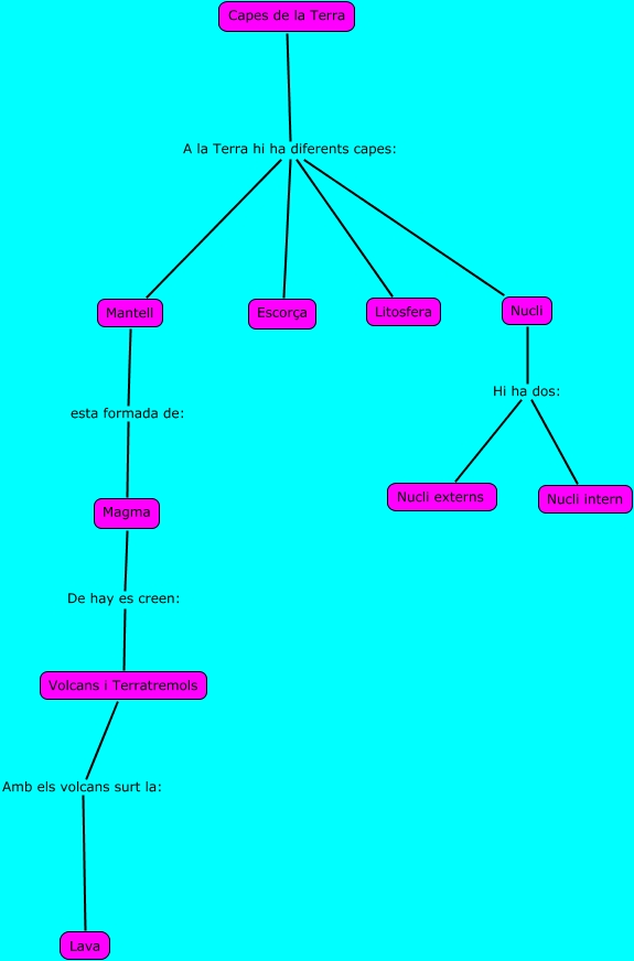 Este Cmap, tiene información relacionada con: Capes de la terra, Capes de la Terra A la Terra hi ha diferents capes: Nucli, Volcans i Terratremols Amb els volcans surt la: Lava, Mantell esta formada de: Magma, Nucli Hi ha dos: Nucli intern, Magma De hay es creen: Volcans i Terratremols, Nucli Hi ha dos: Nucli externs, Capes de la Terra A la Terra hi ha diferents capes: Escorça, Capes de la Terra A la Terra hi ha diferents capes: Mantell, Capes de la Terra A la Terra hi ha diferents capes: Litosfera