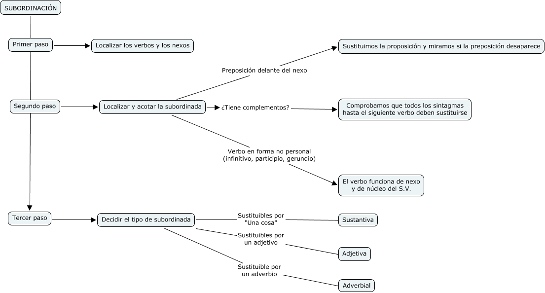 Este Cmap, tiene información relacionada con: Oraciones Subordinadas, Localizar y acotar la subordinada Verbo en forma no personal (infinitivo, participio, gerundio) El verbo funciona de nexo y de núcleo del S.V., Tercer paso Decidir el tipo de subordinada, SUBORDINACIÓN Tercer paso, Localizar y acotar la subordinada ¿Tiene complementos? Comprobamos que todos los sintagmas hasta el siguiente verbo deben sustituirse, Primer paso Localizar los verbos y los nexos, Decidir el tipo de subordinada Sustituible por un adverbio Adverbial, Decidir el tipo de subordinada Sustituibles por "Una cosa" Sustantiva, Segundo paso Localizar y acotar la subordinada, Decidir el tipo de subordinada Sustituibles por un adjetivo Adjetiva, Localizar y acotar la subordinada Preposición delante del nexo Sustituimos la proposición y miramos si la preposición desaparece