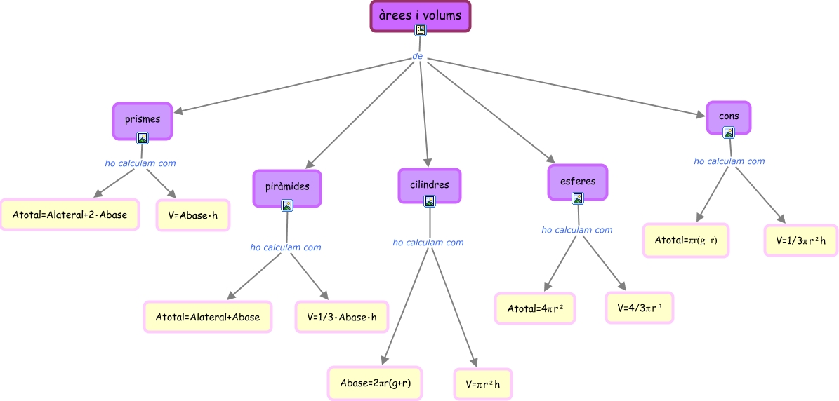 Este Cmap, tiene información relacionada con: àrees i volums2, esferes ho calculam com <math xmlns="http://www.w3.org/1998/Math/MathML"> <mrow> <mtext> Atotal=4π </mtext> <mmultiscripts> <mtext> r </mtext> <none/> <mtext> 2 </mtext> </mmultiscripts> </mrow> </math>, cilindres ho calculam com <math xmlns="http://www.w3.org/1998/Math/MathML"> <mrow> <mtext> V=π </mtext> <mmultiscripts> <mtext> r </mtext> <none/> <mtext> 2 </mtext> </mmultiscripts> <mtext> h </mtext> </mrow> </math>, cons ho calculam com Atotal=πr(g+r), cons ho calculam com <math xmlns="http://www.w3.org/1998/Math/MathML"> <mrow> <mtext> V=1/3π </mtext> <mmultiscripts> <mtext> r </mtext> <none/> <mtext> 2 </mtext> </mmultiscripts> <mtext> h </mtext> </mrow> </math>, àrees i volums de cons, cilindres ho calculam com <math xmlns="http://www.w3.org/1998/Math/MathML"> <mtext> Abase=2πr(g+r) </mtext> </math>, esferes ho calculam com <math xmlns="http://www.w3.org/1998/Math/MathML"> <mrow> <mtext> V=4/3π </mtext> <mmultiscripts> <mtext> r </mtext> <none/> <mtext> 3 </mtext> </mmultiscripts> </mrow> </math>, piràmides ho calculam com <math xmlns="http://www.w3.org/1998/Math/MathML"> <mtext> V=1/3⋅Abase⋅h </mtext> </math>, prismes ho calculam com V=Abase⋅h, àrees i volums de cilindres, piràmides ho calculam com <math xmlns="http://www.w3.org/1998/Math/MathML"> <mrow> <mtext> Atotal=Alateral+Abase </mtext> </mrow> </math>, àrees i volums de piràmides, prismes ho calculam com Atotal=Alateral+2⋅Abase, àrees i volums de prismes, àrees i volums de esferes