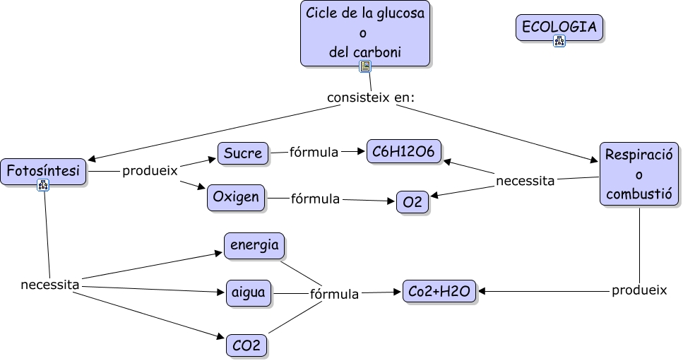 Este mapa conceptual tiene información relacionada a: cicle de la glucosa, Sucre fórmula C6H12O6, Cicle de la glucosa o del carboni consisteix en: Fotosíntesi, Fotosíntesi necessita energia, aigua fórmula Co2+H2O, Fotosíntesi produeix Sucre, Respiració o combustió necessita C6H12O6, CO2 fórmula Co2+H2O, energia fórmula Co2+H2O, Oxigen fórmula O2, Respiració o combustió necessita O2, Cicle de la glucosa o del carboni consisteix en: Respiració o combustió, Fotosíntesi produeix Oxigen, Fotosíntesi necessita aigua, Respiració o combustió produeix Co2+H2O, Fotosíntesi necessita CO2