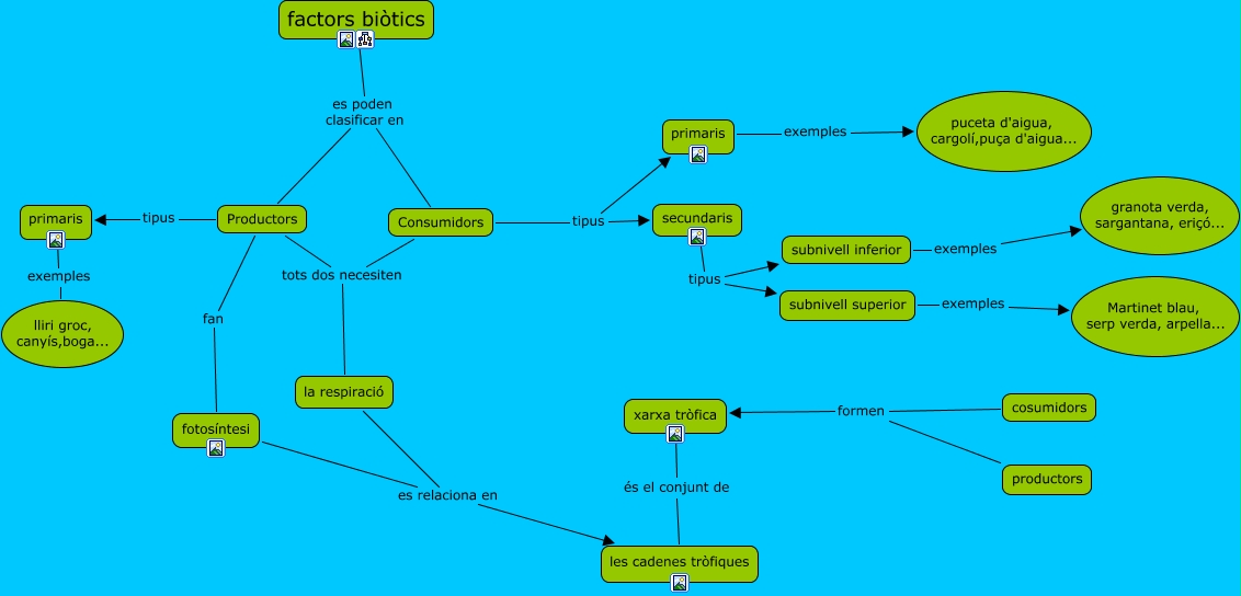 Este mapa conceptual tiene información relacionada a: factors biòtics, secundaris tipus subnivell superior, Productors fan fotosíntesi, cosumidors formen xarxa tròfica, Productors tipus primaris, fotosíntesi es relaciona en les cadenes tròfiques, productors formen xarxa tròfica, subnivell superior exemples Martinet blau, serp verda, arpella..., xarxa tròfica és el conjunt de les cadenes tròfiques, factors biòtics es poden clasificar en Productors, factors biòtics es poden clasificar en Consumidors, la respiració es relaciona en les cadenes tròfiques, Consumidors tots dos necesiten la respiració, subnivell inferior exemples granota verda, sargantana, eriçó..., primaris exemples lliri groc, canyís,boga..., Productors tots dos necesiten la respiració, Consumidors tipus primaris, primaris exemples puceta d'aigua, cargolí,puça d'aigua..., secundaris tipus subnivell inferior, Consumidors tipus secundaris