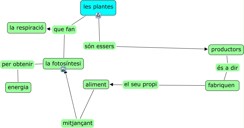 Este mapa conceptual tiene información relacionada a: le plantes, les plantes que fan la fotosíntesi, la fotosíntesi per obtenir energia, fabriquen el seu propi aliment, les plantes que fan la respiració, les plantes són essers productors, productors és a dir fabriquen, aliment mitjançant la fotosíntesi
