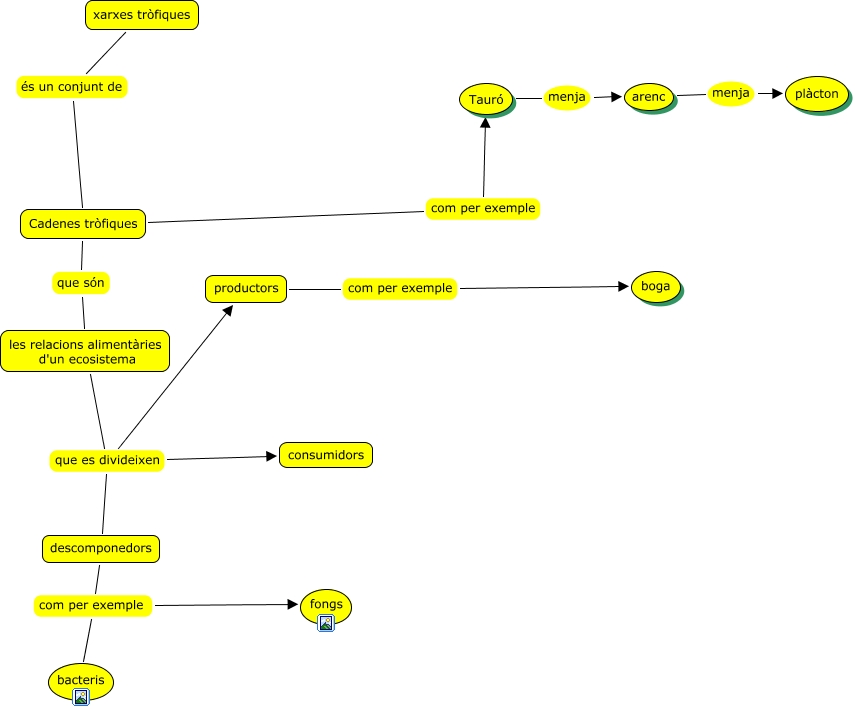 Este Cmap, tiene información relacionada con: xarxes tròfiques, les relacions alimentàries d'un ecosistema que es divideixen consumidors, descomponedors com per exemple bacteris, Cadenes tròfiques que són les relacions alimentàries d'un ecosistema, Cadenes tròfiques com per exemple Tauró, les relacions alimentàries d'un ecosistema que es divideixen productors, Tauró menja arenc, les relacions alimentàries d'un ecosistema que es divideixen descomponedors, xarxes tròfiques és un conjunt de Cadenes tròfiques, productors com per exemple boga, arenc menja plàcton, descomponedors com per exemple fongs
