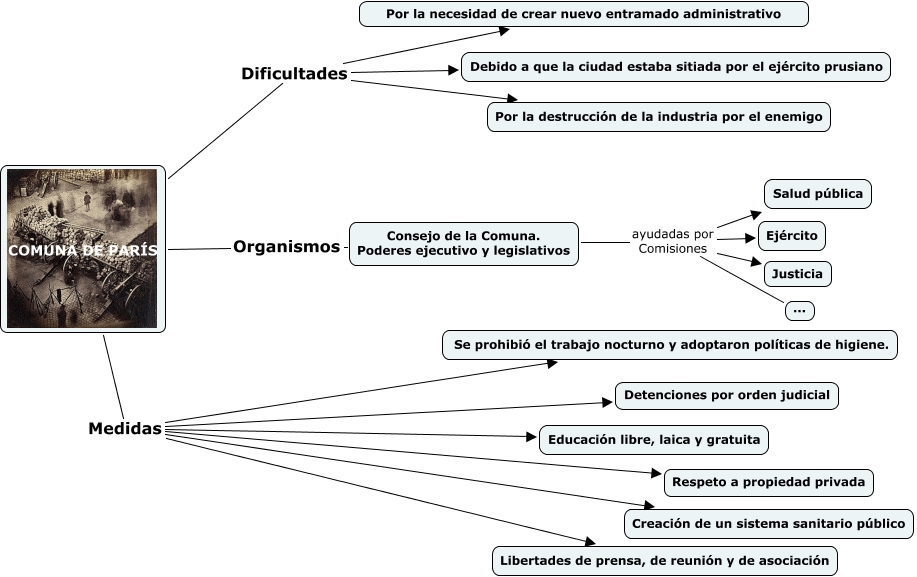 Este Cmap, tiene información relacionada con: Comuna de París, COMUNA DE PARÍS Medidas Educación libre, laica y gratuita, COMUNA DE PARÍS Medidas Libertades de prensa, de reunión y de asociación, COMUNA DE PARÍS Organismos Consejo de la Comuna. Poderes ejecutivo y legislativos, COMUNA DE PARÍS Dificultades Debido a que la ciudad estaba sitiada por el ejército prusiano, Consejo de la Comuna. Poderes ejecutivo y legislativos ayudadas por Comisiones ..., COMUNA DE PARÍS Dificultades Por la destrucción de la industria por el enemigo, COMUNA DE PARÍS Medidas Respeto a propiedad privada, COMUNA DE PARÍS Dificultades Por la necesidad de crear nuevo entramado administrativo, Consejo de la Comuna. Poderes ejecutivo y legislativos ayudadas por Comisiones Justicia, COMUNA DE PARÍS Medidas Se prohibió el trabajo nocturno y adoptaron políticas de higiene., Consejo de la Comuna. Poderes ejecutivo y legislativos ayudadas por Comisiones Salud pública, COMUNA DE PARÍS Medidas Creación de un sistema sanitario público, COMUNA DE PARÍS Medidas Detenciones por orden judicial, Consejo de la Comuna. Poderes ejecutivo y legislativos ayudadas por Comisiones Ejército