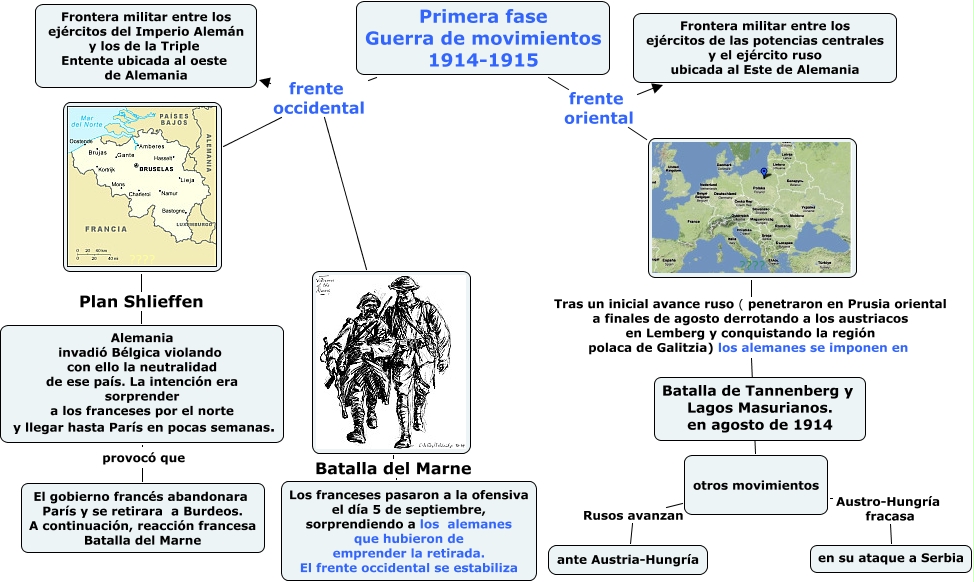 Este Cmap, tiene información relacionada con: Guerra_de_movimientos, ???? Tras un inicial avance ruso ( penetraron en Prusia oriental a finales de agosto derrotando a los austriacos en Lemberg y conquistando la región polaca de Galitzia) los alemanes se imponen en otros movimientos, ???? Batalla del Marne Los franceses pasaron a la ofensiva el día 5 de septiembre, sorprendiendo a los alemanes que hubieron de emprender la retirada. El frente occidental se estabiliza, ???? Batalla del Marne Los franceses pasaron a la ofensiva el día 5 de septiembre, sorprendiendo a los alemanes que hubieron de emprender la retirada. El frente occidental se estabiliza, Primera fase Guerra de movimientos 1914-1915 frente oriental Frontera militar entre los ejércitos de las potencias centrales y el ejército ruso ubicada al Este de Alemania, ???? Batalla del Marne Los franceses pasaron a la ofensiva el día 5 de septiembre, sorprendiendo a los alemanes que hubieron de emprender la retirada. El frente occidental se estabiliza, Primera fase Guerra de movimientos 1914-1915 frente occidental ????, otros movimientos Rusos avanzan ante Austria-Hungría, Alemania invadió Bélgica violando con ello la neutralidad de ese país. La intención era sorprender a los franceses por el norte y llegar hasta París en pocas semanas. provocó que El gobierno francés abandonara París y se retirara a Burdeos. A continuación, reacción francesa Batalla del Marne, ???? Batalla del Marne Los franceses pasaron a la ofensiva el día 5 de septiembre, sorprendiendo a los alemanes que hubieron de emprender la retirada. El frente occidental se estabiliza, otros movimientos Austro-Hungría fracasa en su ataque a Serbia, Primera fase Guerra de movimientos 1914-1915 frente occidental ????, ???? Plan Shlieffen Alemania invadió Bélgica violando con ello la neutralidad de ese país. La intención era sorprender a los franceses por el norte y llegar hasta París en pocas semanas., Primera fase Guerra de movimientos 1914-1915 frente oriental ????, ???? Plan Shlieffen Alemania invadió Bélgica violando con ello la neutralidad de ese país. La intención era sorprender a los franceses por el norte y llegar hasta París en pocas semanas., Primera fase Guerra de movimientos 1914-1915 frente occidental Frontera militar entre los ejércitos del Imperio Alemán y los de la Triple Entente ubicada al oeste de Alemania