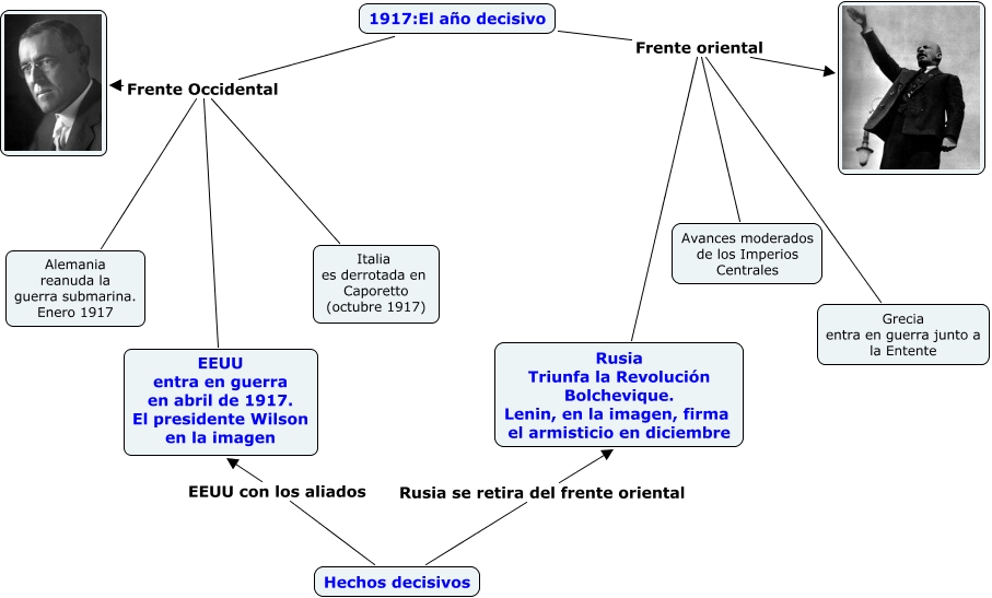Este Cmap, tiene información relacionada con: 1917_El año decisivo, 1917:El año decisivo Frente Occidental Alemania reanuda la guerra submarina. Enero 1917, 1917:El año decisivo Frente oriental Avances moderados de los Imperios Centrales, 1917:El año decisivo Frente Occidental, 1917:El año decisivo Frente oriental Rusia Triunfa la Revolución Bolchevique. Lenin, en la imagen, firma el armisticio en diciembre, Hechos decisivos EEUU con los aliados EEUU entra en guerra en abril de 1917. El presidente Wilson en la imagen, Hechos decisivos Rusia se retira del frente oriental Rusia Triunfa la Revolución Bolchevique. Lenin, en la imagen, firma el armisticio en diciembre, 1917:El año decisivo Frente oriental ????, 1917:El año decisivo Frente oriental Grecia entra en guerra junto a la Entente, 1917:El año decisivo Frente Occidental, 1917:El año decisivo Frente Occidental Italia es derrotada en Caporetto (octubre 1917), 1917:El año decisivo Frente Occidental EEUU entra en guerra en abril de 1917. El presidente Wilson en la imagen