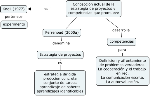 Este Cmap, tiene información relacionada con: 2.2 Estrategia de Proyectos, Concepción actual de la estrategia de proyectos y competencias que promueve desarrolla competencias, Concepción actual de la estrategia de proyectos y competencias que promueve ???? Perrenoud (2000a), Perrenoud (2000a) denomina Estrategia de proyectos, Concepción actual de la estrategia de proyectos y competencias que promueve es Knoll (1977), Knoll (1977) pertenece experimento, competencias para Definicion y afrontamiento de problemas verdaderos. La cooperación y el trabajo en red. La comunicación escrita. La autoevaluación., Estrategia de proyectos es estrategia dirigida prodccion concreta conjunto de tareas aprendizaje de saberes aprendizajes identificables
