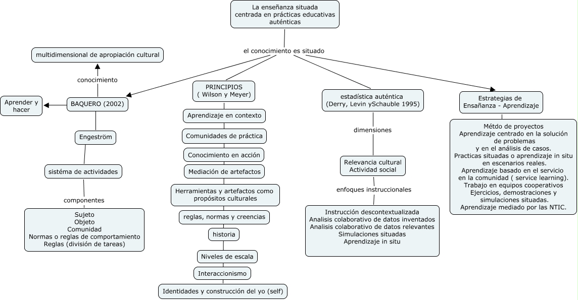 Este Cmap, tiene información relacionada con: 1.4 Prácticas educativas, La enseñanza situada centrada en prácticas educativas auténticas el conocimiento es situado BAQUERO (2002), La enseñanza situada centrada en prácticas educativas auténticas el conocimiento es situado estadística auténtica (Derry, Levin ySchauble 1995), sistéma de actividades componentes Sujeto Objeto Comunidad Normas o reglas de comportamiento Reglas (división de tareas), estadística auténtica (Derry, Levin ySchauble 1995) dimensiones Relevancia cultural Actividad social, Relevancia cultural Actividad social enfoques instruccionales Instrucción descontextualizada Analisis colaborativo de datos inventados Analisis colaborativo de datos relevantes Simulaciones situadas Aprendizaje in situ, BAQUERO (2002) conocimiento multidimensional de apropiación cultural, PRINCIPIOS ( Wilson y Meyer) ???? Identidades y construcción del yo (self), BAQUERO (2002) ???? Aprender y hacer, BAQUERO (2002) ???? Engeström, Estrategias de Ensañanza - Aprendizaje son Métdo de proyectos Aprendizaje centrado en la solución de problemas y en el análisis de casos. Practicas situadas o aprendizaje in situ en escenarios reales. Aprendizaje basado en el servicio en la comunidad ( service learning). Trabajo en equipos cooperativos Ejercicios, demostraciones y simulaciones situadas. Aprendizaje mediado por las NTIC., La enseñanza situada centrada en prácticas educativas auténticas el conocimiento es situado Estrategias de Ensañanza - Aprendizaje, Engeström ???? sistéma de actividades, La enseñanza situada centrada en prácticas educativas auténticas el conocimiento es situado PRINCIPIOS ( Wilson y Meyer)