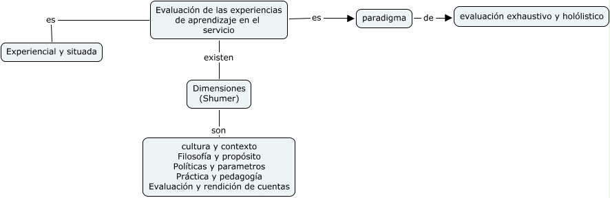 Este Cmap, tiene información relacionada con: 4.4 Evaluacion de experiencias, Evaluación de las experiencias de aprendizaje en el servicio existen Dimensiones (Shumer), Dimensiones (Shumer) son cultura y contexto Filosofía y propósito Políticas y parametros Práctica y pedagogía Evaluación y rendición de cuentas, paradigma de evaluación exhaustivo y holólistico, Evaluación de las experiencias de aprendizaje en el servicio es Experiencial y situada, Evaluación de las experiencias de aprendizaje en el servicio es paradigma