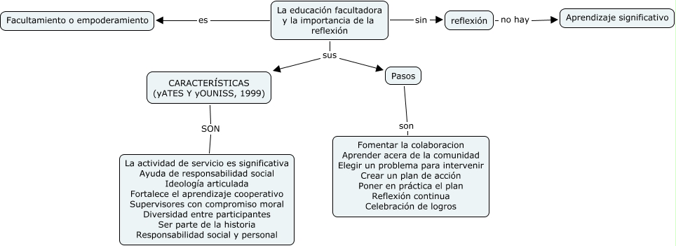 Este Cmap, tiene información relacionada con: 4.2 La reflexión, La educación facultadora y la importancia de la reflexión sus Pasos, reflexión no hay Aprendizaje significativo, La educación facultadora y la importancia de la reflexión sin reflexión, CARACTERÍSTICAS (yATES Y yOUNISS, 1999) SON La actividad de servicio es significativa Ayuda de responsabilidad social Ideología articulada Fortalece el aprendizaje cooperativo Supervisores con compromiso moral Diversidad entre participantes Ser parte de la historia Responsabilidad social y personal, La educación facultadora y la importancia de la reflexión es Facultamiento o empoderamiento, Pasos son Fomentar la colaboracion Aprender acera de la comunidad Elegir un problema para intervenir Crear un plan de acción Poner en práctica el plan Reflexión continua Celebración de logros, La educación facultadora y la importancia de la reflexión sus CARACTERÍSTICAS (yATES Y yOUNISS, 1999)
