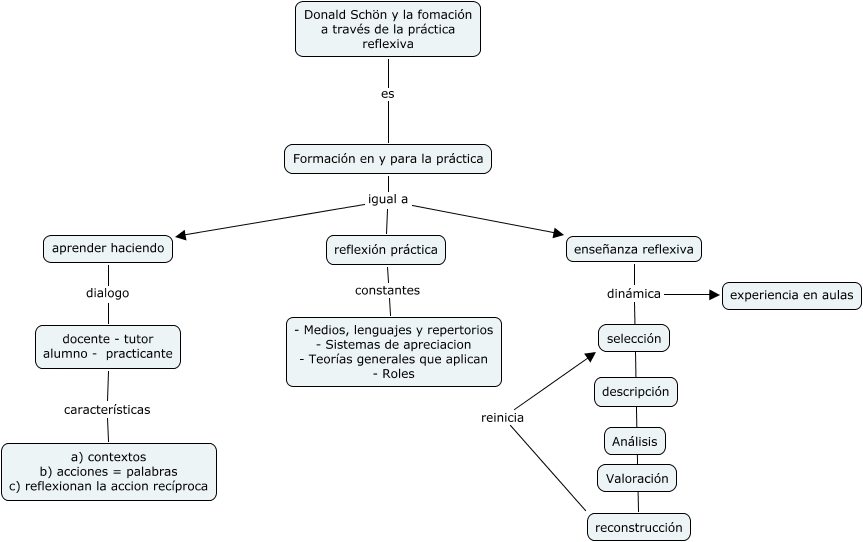 Este Cmap, tiene información relacionada con: 1.2 Donald Schon, Formación en y para la práctica igual a reflexión práctica, Formación en y para la práctica igual a aprender haciendo, docente - tutor alumno - practicante características a) contextos b) acciones = palabras c) reflexionan la accion recíproca, Formación en y para la práctica igual a enseñanza reflexiva, enseñanza reflexiva dinámica experiencia en aulas, reconstrucción reinicia selección, aprender haciendo dialogo docente - tutor alumno - practicante, Donald Schön y la fomación a través de la práctica reflexiva es Formación en y para la práctica, reflexión práctica constantes - Medios, lenguajes y repertorios - Sistemas de apreciacion - Teorías generales que aplican - Roles, enseñanza reflexiva dinámica reconstrucción