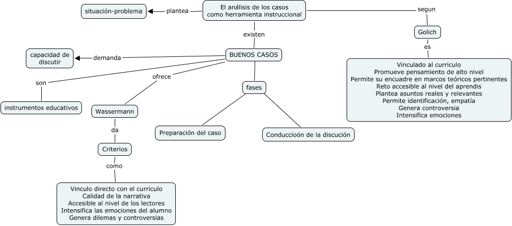 Este Cmap, tiene información relacionada con: 3.5 Herramienta instruccional, Criterios como Vinculo directo con el curriculo Calidad de la narrativa Accesible al nivel de los lectores Intensifica las emociones del alumno Genera dilemas y controversias, BUENOS CASOS demanda capacidad de discutir, El análisis de los casos como herramienta instruccional plantea situación-problema, BUENOS CASOS ofrece Wassermann, El análisis de los casos como herramienta instruccional segun Golich, Wassermann da Criterios, El análisis de los casos como herramienta instruccional existen BUENOS CASOS, fases ???? Conduccioón de la discución, fases ???? Preparación del caso, Golich es Vinculado al curriculo Promueve pensamiento de alto nivel Permite su encuadre en marcos teóricos pertinentes Reto accesible al nivel del aprendis Plantea asuntos reales y relevantes Permite identificación, empatía Genera controversia Intensifica emociones, BUENOS CASOS ???? fases, BUENOS CASOS son instrumentos educativos