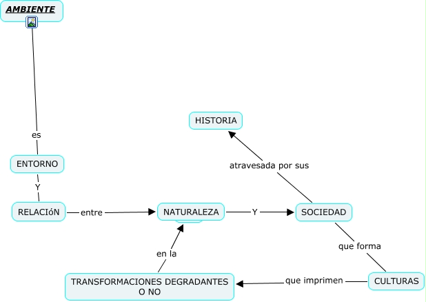 Este mapa conceptual tiene información relacionada a: ENTENDER EL AMBIENTE, ENTORNO Y RELACIóN, SOCIEDAD que forma CULTURAS, CULTURAS que imprimen TRANSFORMACIONES DEGRADANTES O NO, RELACIóN entre NATURALEZA, AMBIENTE es ENTORNO, TRANSFORMACIONES DEGRADANTES O NO en la ????, NATURALEZA Y SOCIEDAD, SOCIEDAD atravesada por sus HISTORIA